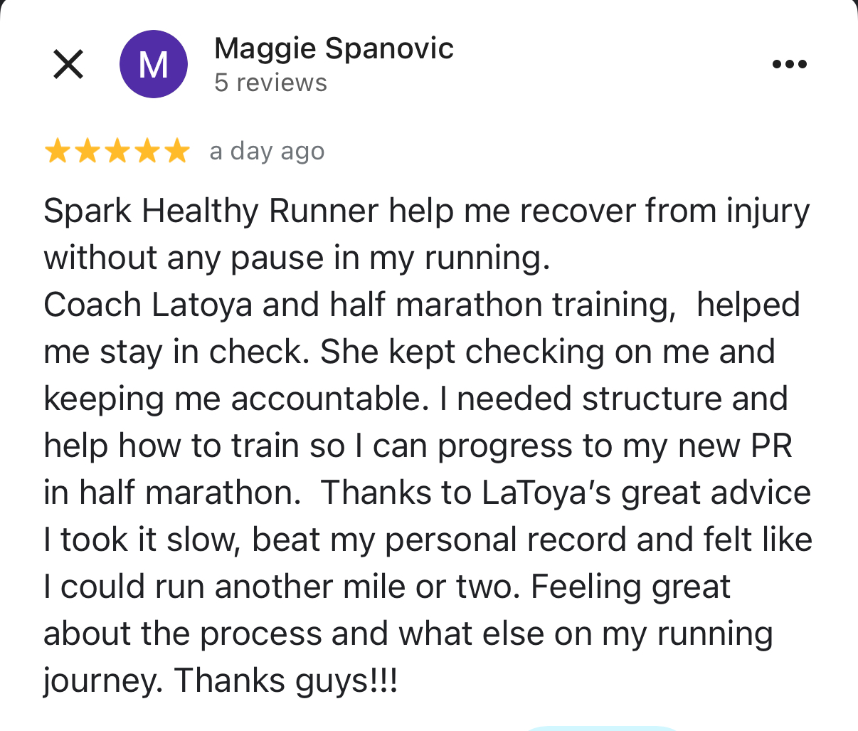 I had an incredible experience working with Coach LaToya and the Spark Healthy Runner team! Prior to joining the program, I had been running recreationally for 3 years, but knew little about how to incorporate strength training with my running.